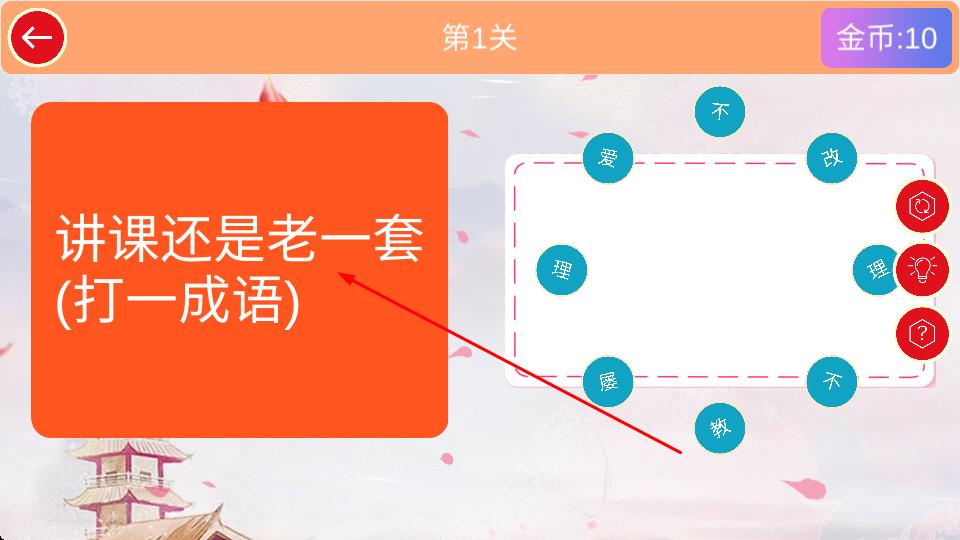 1、观察题目提示,从右侧候选字中选取合适文字,拖动至空白区域尝试组合,拼出对应成语答案,需精准把握字与字逻辑关联。