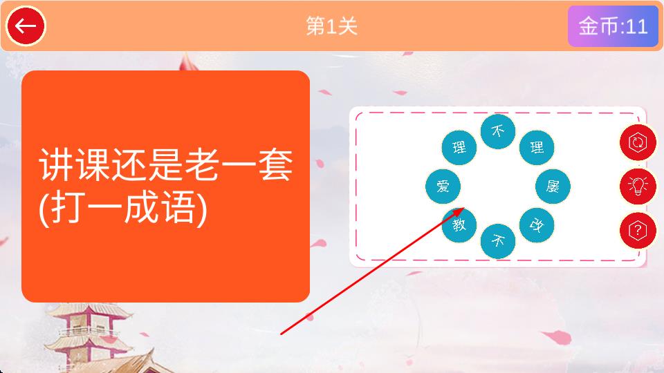 2、遇困难可点击右侧提示按钮,如灯泡图标获取线索,借助线索缩小选字范围,快速锁定正确成语组合方向。