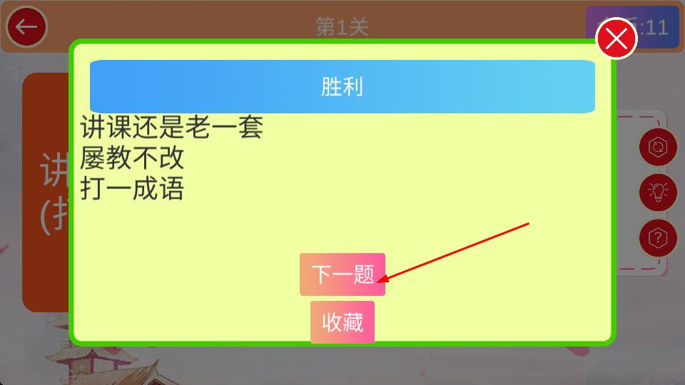3、成功拼出成语后,可选择下一题继续挑战新谜题,或点击收藏留存经典题目,积累更多猜谜经验与成语知识。