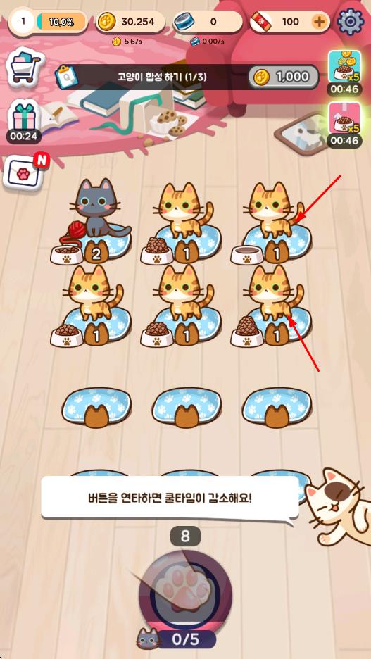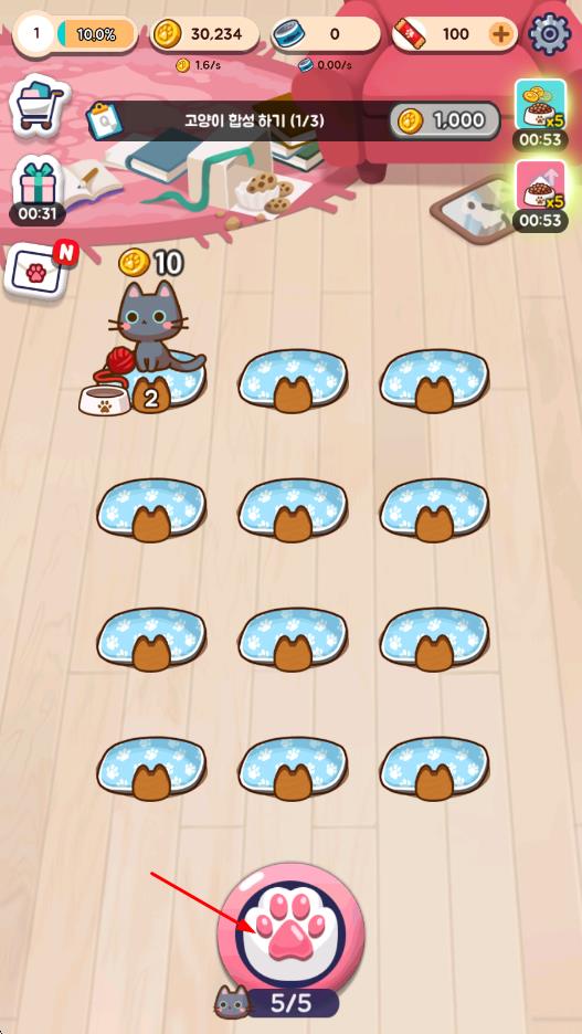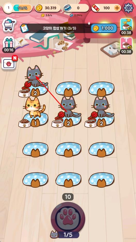 2、与猫咪互动获取爱心值,用爱心值购买饲料和道具,加速猫咪成长与合并效率,解锁更多饲养空间。