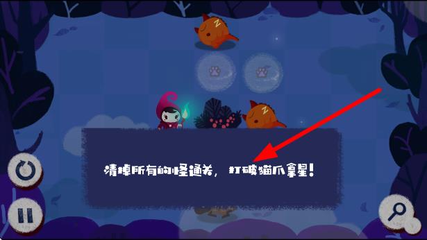 2、遇到提示清掉所有的小怪通关,打破猫爪拿星,要操控角色击败橙色小怪,规划移动路径,利用技能或道具消灭敌人,完成清怪目标。