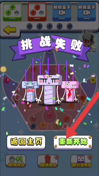 3、显示挑战失败提示,可点击重新开始的按钮,属于挑战未成功后的结算界面,用于引导玩家选择后续操作。