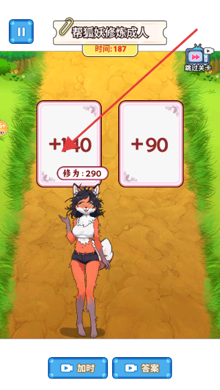3、在帮狐妖修炼成人关卡中,选择合适的运算,如+40或+90,增加狐妖的修为,在规定时间内完成修炼任务。