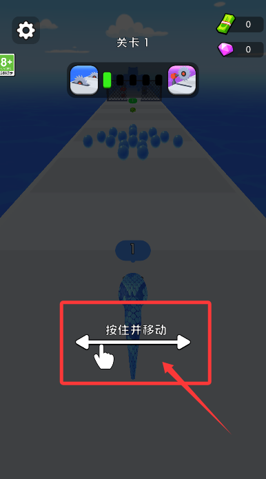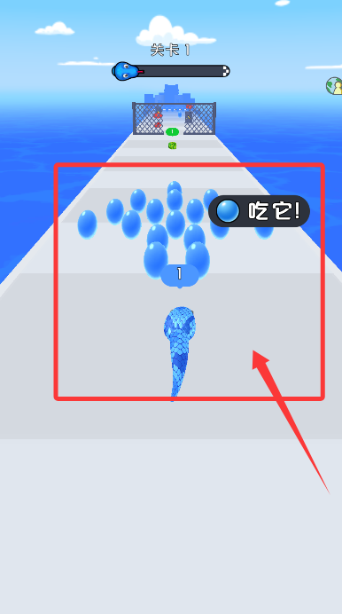 1、开启第一关,手指按住屏幕左右划动,灵活控制小蛇的移动方向。