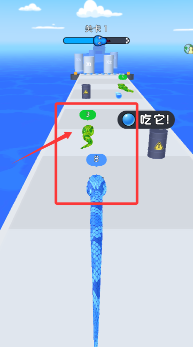 2、沿途吞食蓝色能量球,蛇身会逐渐变长,增强你的闯关优势。