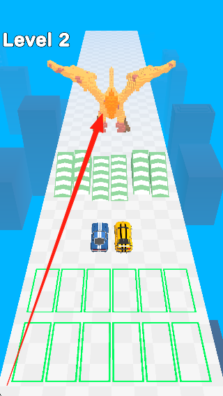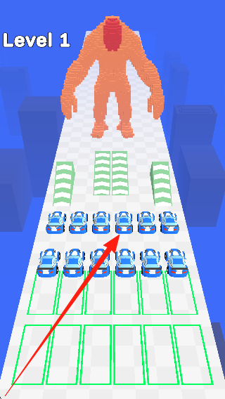 2、在当前区域寻找相同颜色的小汽车进行合并,减少汽车数量,同时熟悉合并的操作节奏和规则。