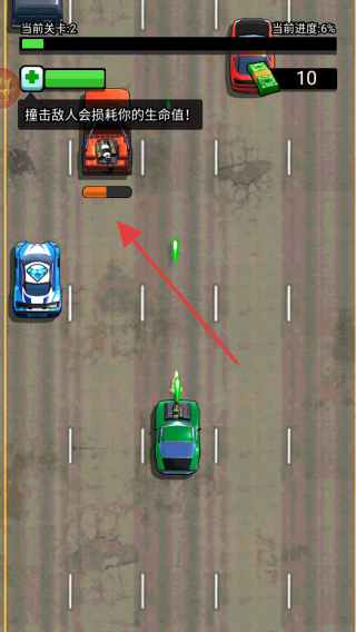 3、在第2关游戏中,继续操控赛车移动,撞击敌人车辆,但要注意撞击敌人会损耗生命值,合理规划移动路线。