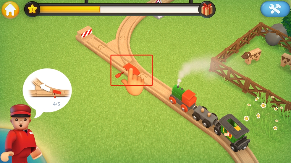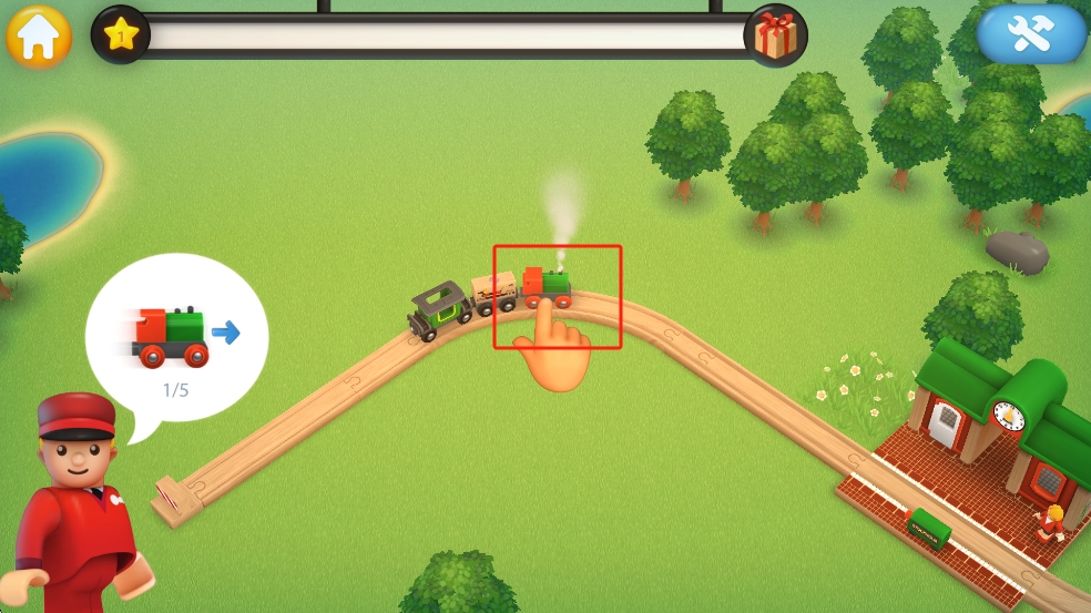 1、点击火车头,操控小火车沿轨道行驶,按指引收集对应车厢,完成1/5等收集任务,借助轨道规划路线。