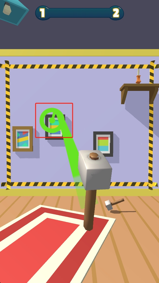 1、操控大锤子,紧盯绿色光标指引的墙上相框位置,全力挥动锤子撞击,借助锤子的强大力量,精准破坏该相框物品。