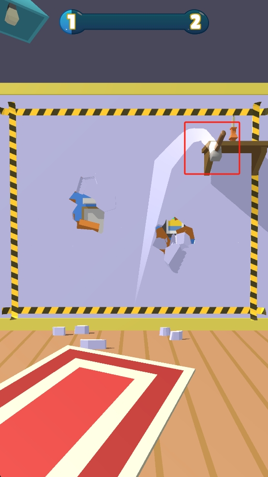 2、利用首次破坏产生的连锁反应,让场景里的小锤子等物件也加入破坏,瞄准架子上的目标物件,持续撞击。