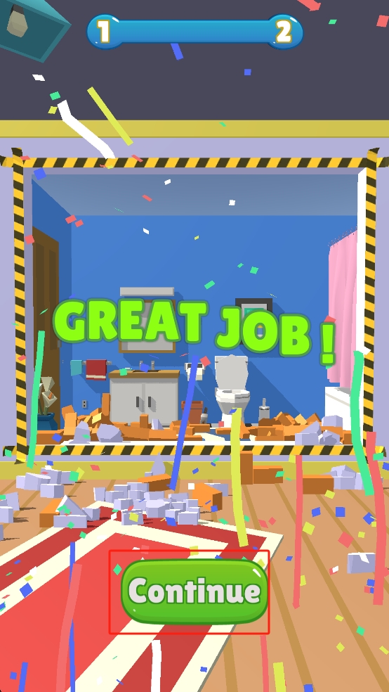 3、成功将当前房间各类物品摧毁后,点击绿色的Continue按钮,顺利进入下一个关卡,对新场景中的物品展开破坏挑战。