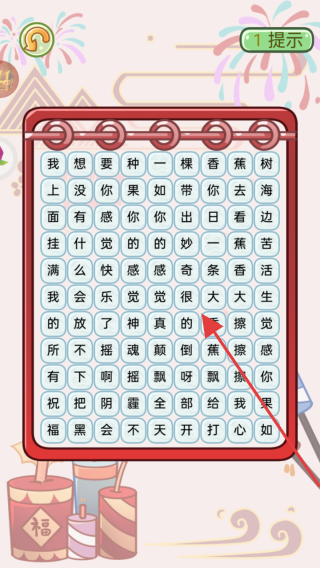 3、在游戏中,从文字矩阵中找出特定文字组合,完成关卡任务,可利用提示功能获取帮助,顺利推进游戏。