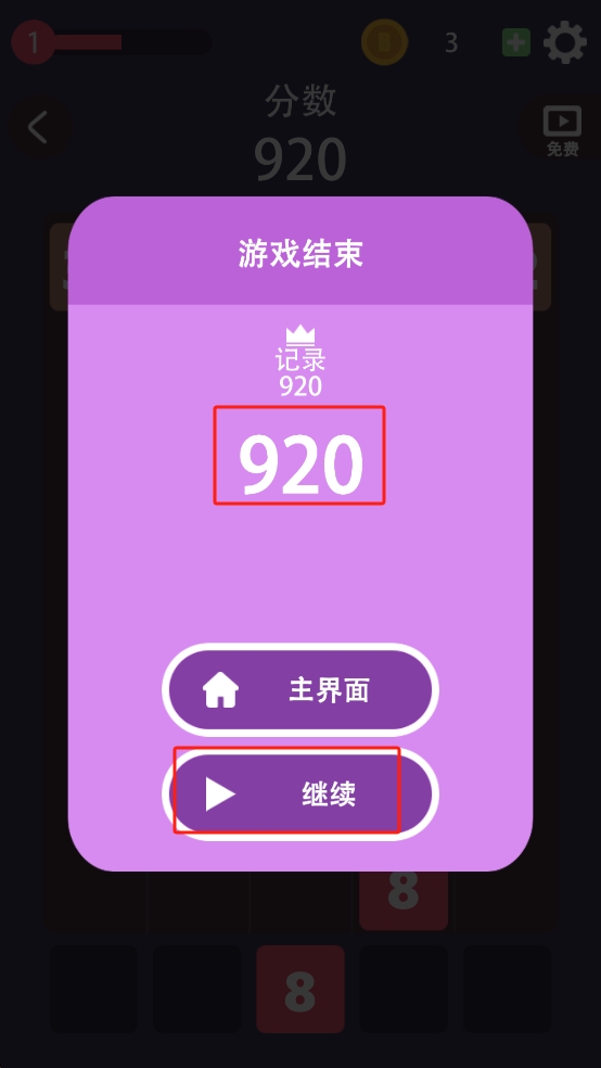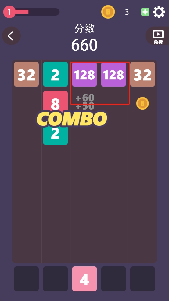 2、游戏中出现相同数值方块,及时点击合并,触发COMBO的连击,获取额外的金币与分数加成。