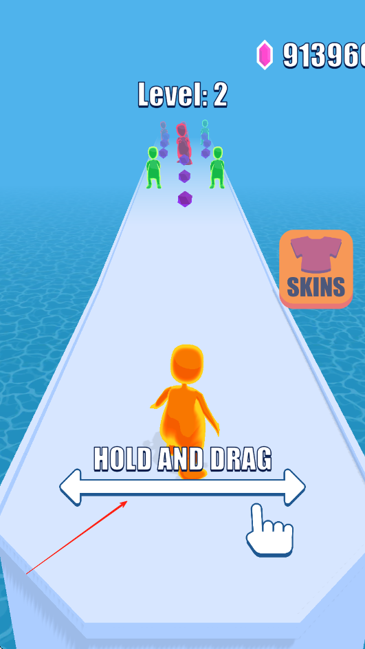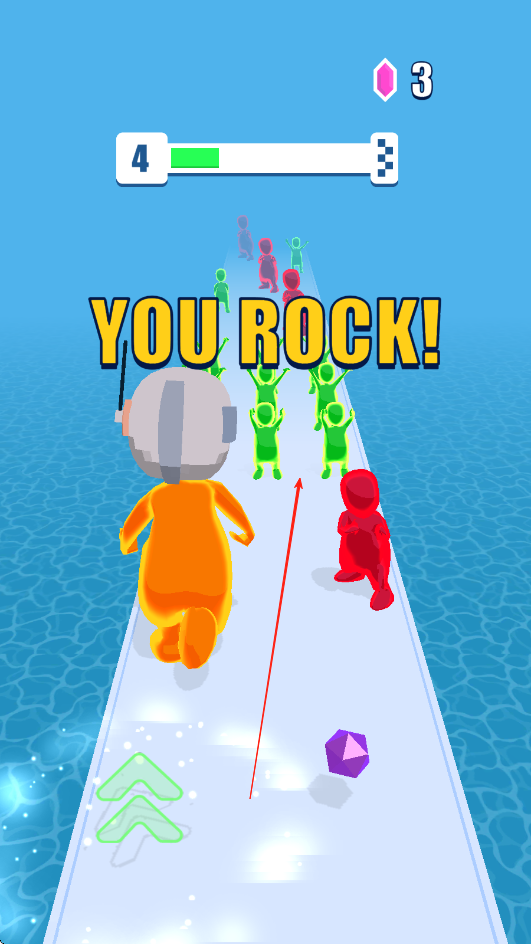 1、我们需要操纵橘色小人向前移动,收集绿色小人和紫色钻石,收集绿色小人会变得越来越壮大。