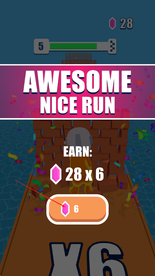 3、到达终点后,壮大后的橘色小人会撞击墙壁,直至身形变小不再能撞毁墙壁为止,脚下踩着是几倍区,就是几倍的奖励。
