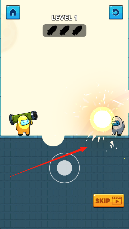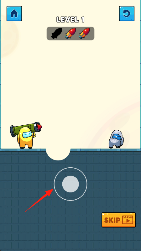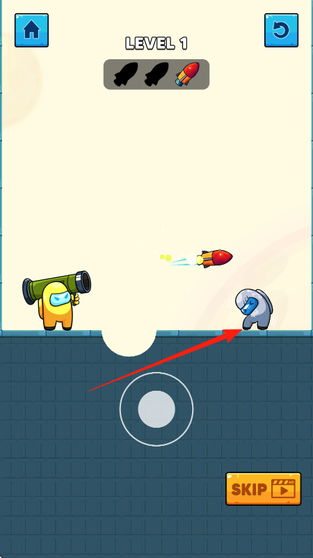 3、用3发火箭弹内命中蓝色角色,成功击败则通关,解锁新关卡;若未命中,可点SKIP跳过广告重玩,反复尝试掌握发射节奏,提升命中率。