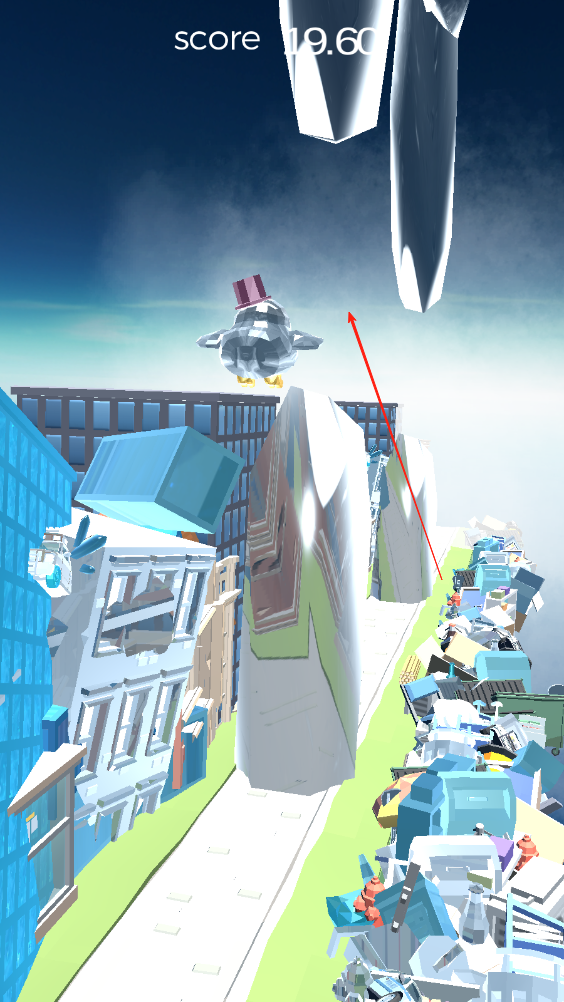 1、点击屏幕冰雕小鸟则能不停飞翔,控制平衡,让冰雕小鸟不坠地粉碎,穿过前方的冰雕障碍。