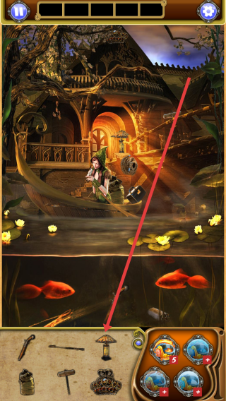 1、最开始游戏开局,先点场景亮处建筑、水面找物品,按照下方逐个收集如枪、灯,注意水下角落。