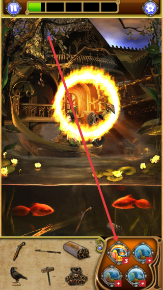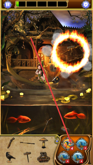 2、看到下面的镜子技能,火焰圈道具拖到障碍物如建筑阴影,解锁新物品,优先用在箭头指引处。