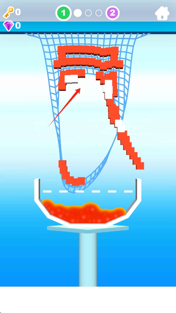 2、关卡中观察红色方块布局,巧妙操作,让方块准确落入容器,完成关卡,滑动切割。