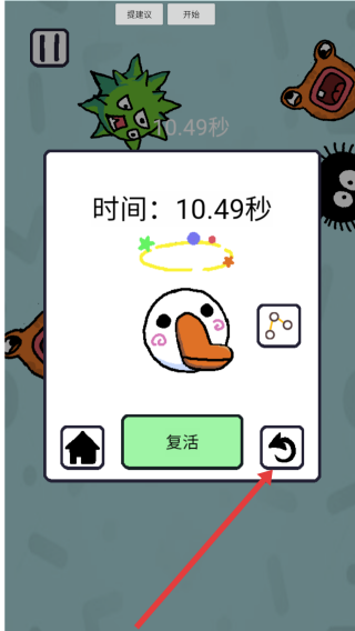 3、角色失败后,在结算界面处,可以点击右侧重开按钮,重新进入关卡,再次尝试躲避挑战。