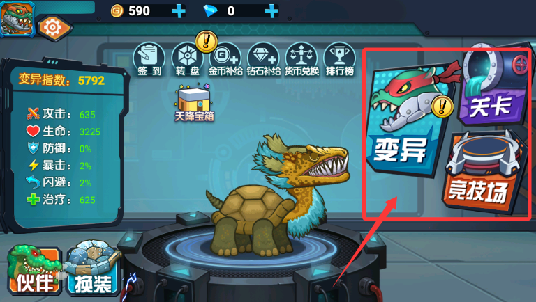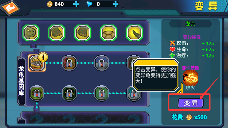 1、前往变异实验室,消耗500金币启动基因改造,增强战龟基础属性。