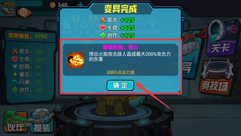 2、改造完成后,查看获得的"喷火"等新技能,确认后关闭属性面板。