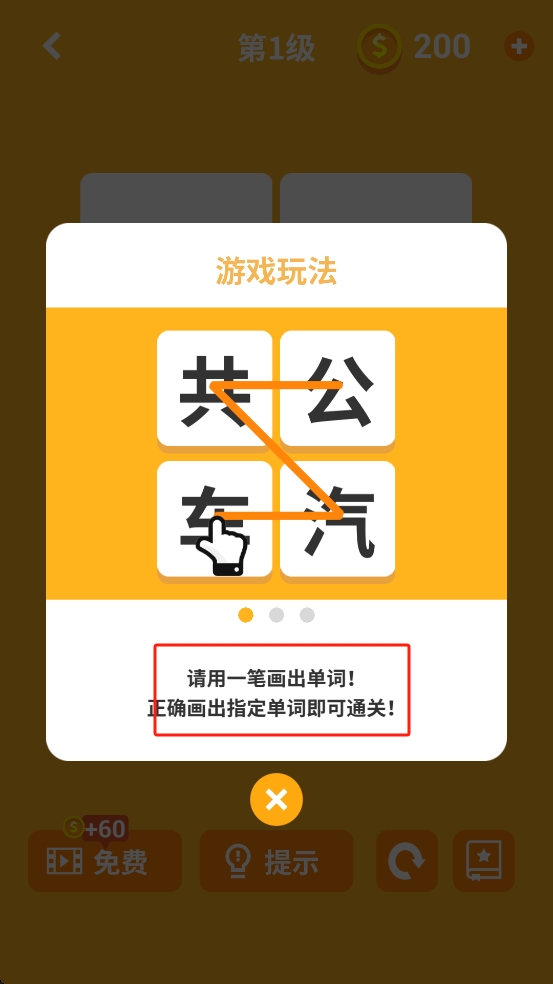 1、开局根据提示熟悉下玩法,手指顺着字的顺序滑,从一个字划到下一个别断,像串珠子似的把字串成词即可。