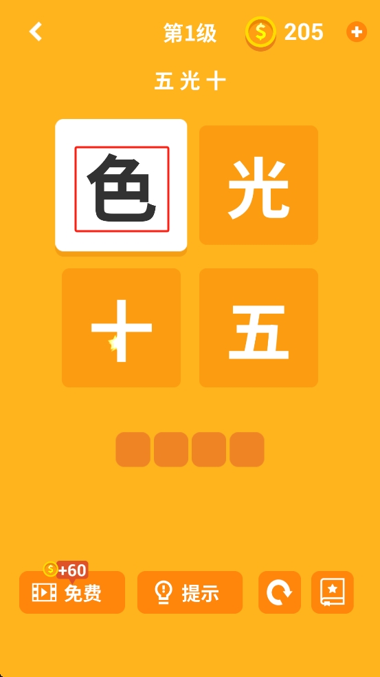 2、这关的题目是五光十色,按五、光、十、色的顺序,挨个点对应的方块,把字拼对成词语。