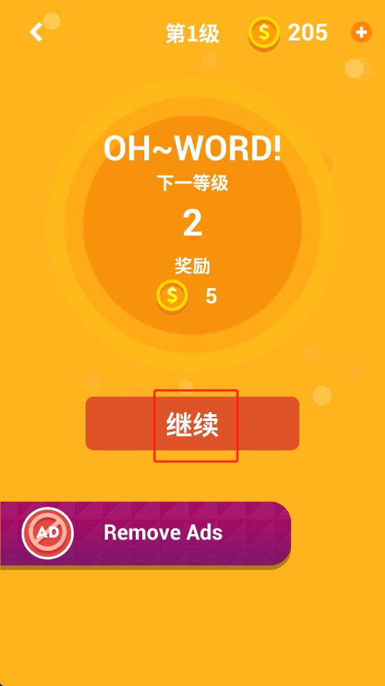 3、闯过当前关卡后,给了5金币奖励,屏幕上有个红通通的继续按钮,点一下就跳到第2级,继续闯关挑战。