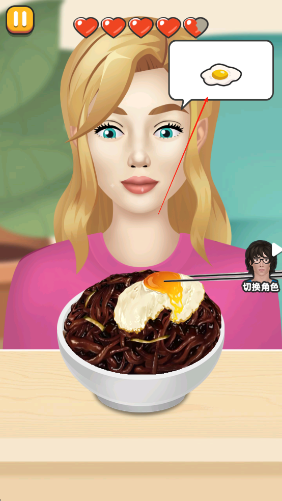 1、先拿起一旁的筷子,根据角色的需求,先夹起煎蛋喂到角色嘴中,等待角色吞下后等待他的下一步需求。