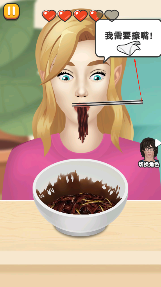 2、根据需求判断角色想吃的食物,当角色嘴角脏了后,会提出擦嘴的需求,点击她的嘴角即可帮她擦嘴。