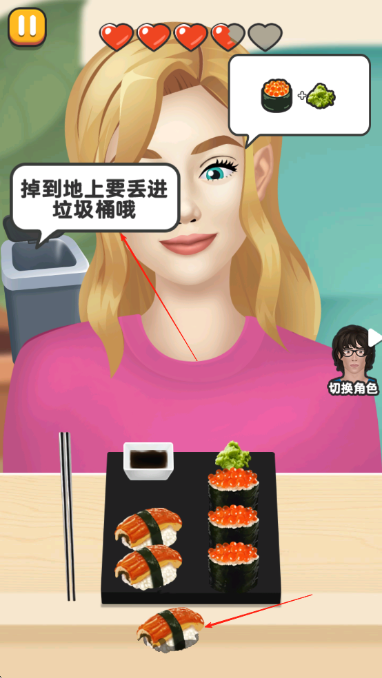 3、确保角色吃掉指定数量的食物,完成当前关卡的喂食目标,即可顺利通关,当有食物掉到桌上就要将食物拖动到垃圾桶里。