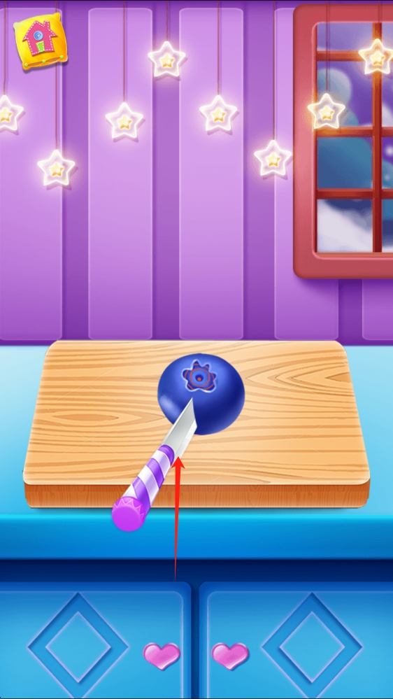 2、游戏中,根据提示,用刀精准切割蓝莓等食材,为制作奶昔准备原料,点击切水果。