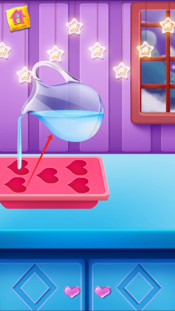3、将液体小心倒入心形模具,按照步骤操作,完成奶昔制作的关键环节,点击倒水。