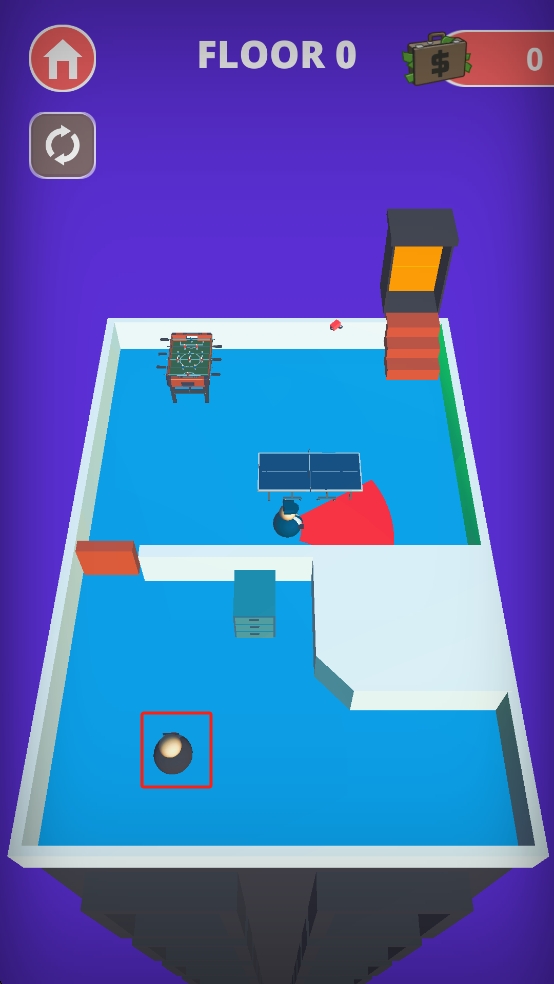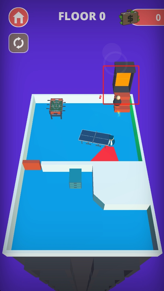 2、引导角色推动物品挡住巡逻者的视线,跨越乒乓球桌等障碍,向着目标门持续移动,完成阶段任务。