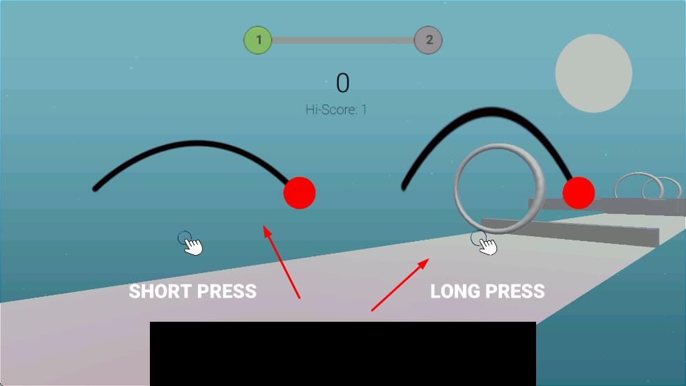 1、操控红色球体在赛道上滚动,赛道上有不同的障碍物和环形结构,通过点击屏幕进行操作,短按和长按可以控制球体的滚动方向和速度。