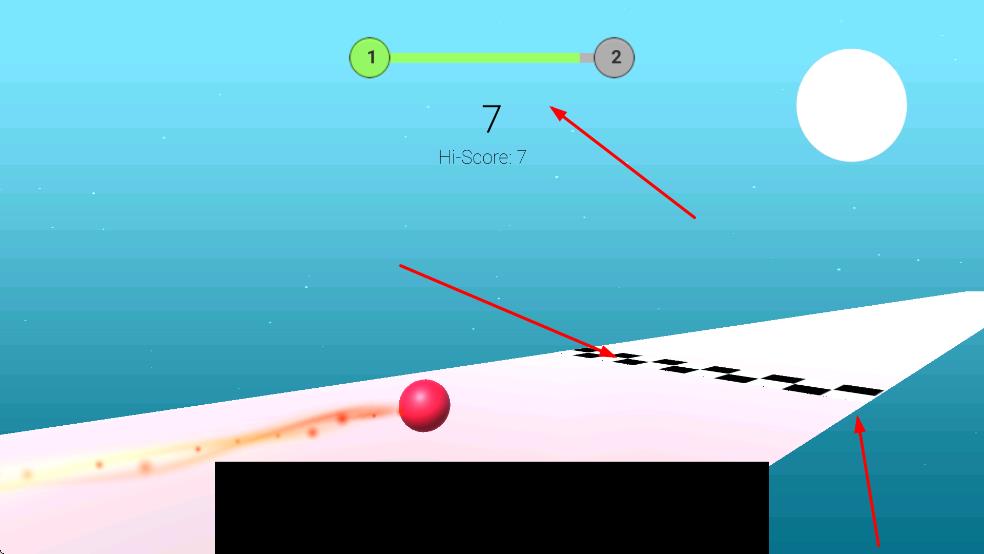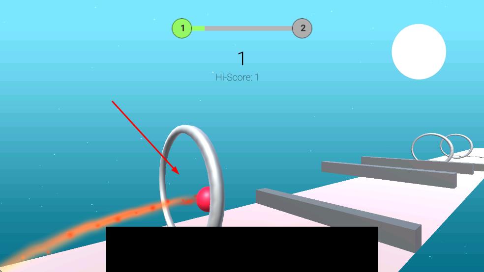 2、引导球体穿过环形结构,收集分数,分数会显示在屏幕上方,同时关注关卡进度条,了解游戏进度。
