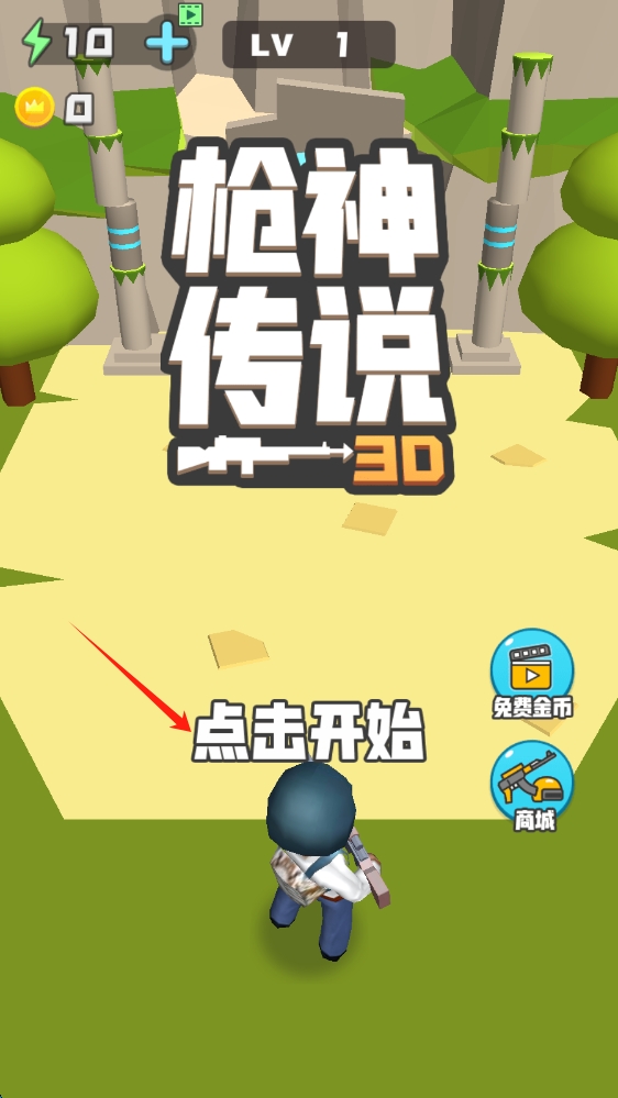 1、在枪神传说3D启动界面,点击点击开始,开启射击冒险之旅,点击屏幕开始游戏。