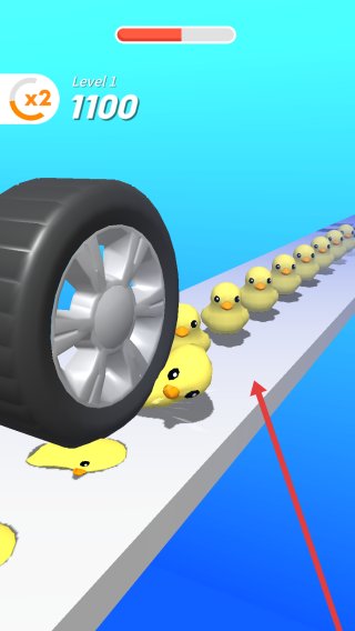 2、在Level-1关卡中,控制滚动的轮胎碾压道路上的小鸭,保持轮胎持续前行,争取高分表现。
