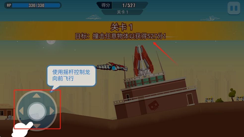 1、进入作品后我们用左侧摇杆控制飞行物方向,让它撞击场景里的建筑、障碍等物体,积累分数到527分的目标。