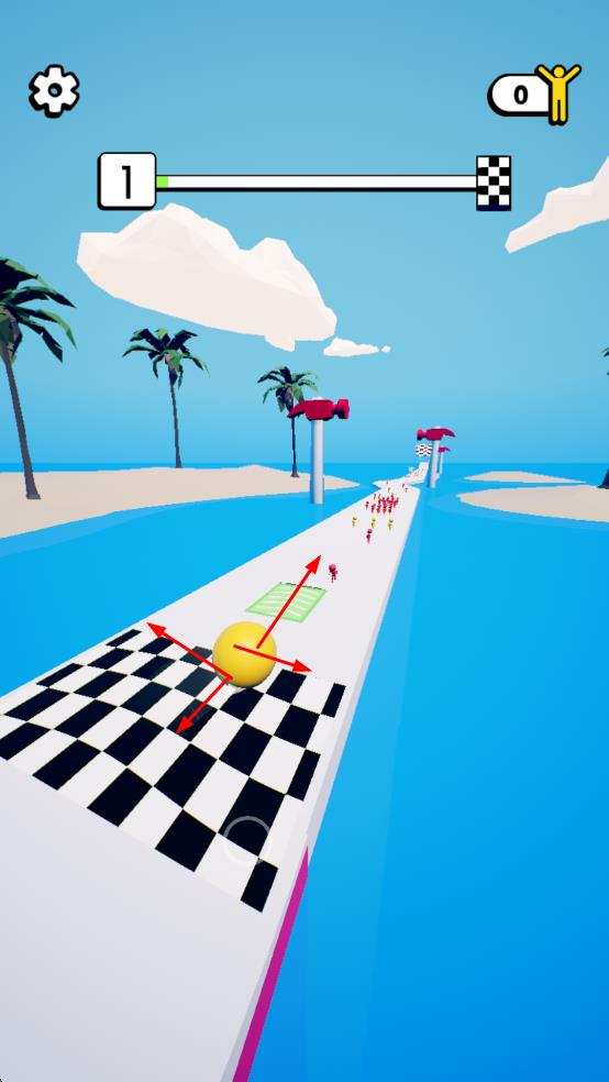 1、操控黄色球体在赛道上滚动,赛道两侧是蓝色水域,周围有棕榈树等装饰,球体可以向前后左右四个方向移动。
