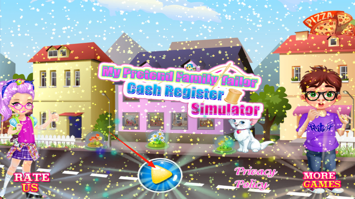 1、点击黄色三角形按钮,进入游戏,开启裁缝店收银模拟之旅体验经营玩法,推进游戏流程。
