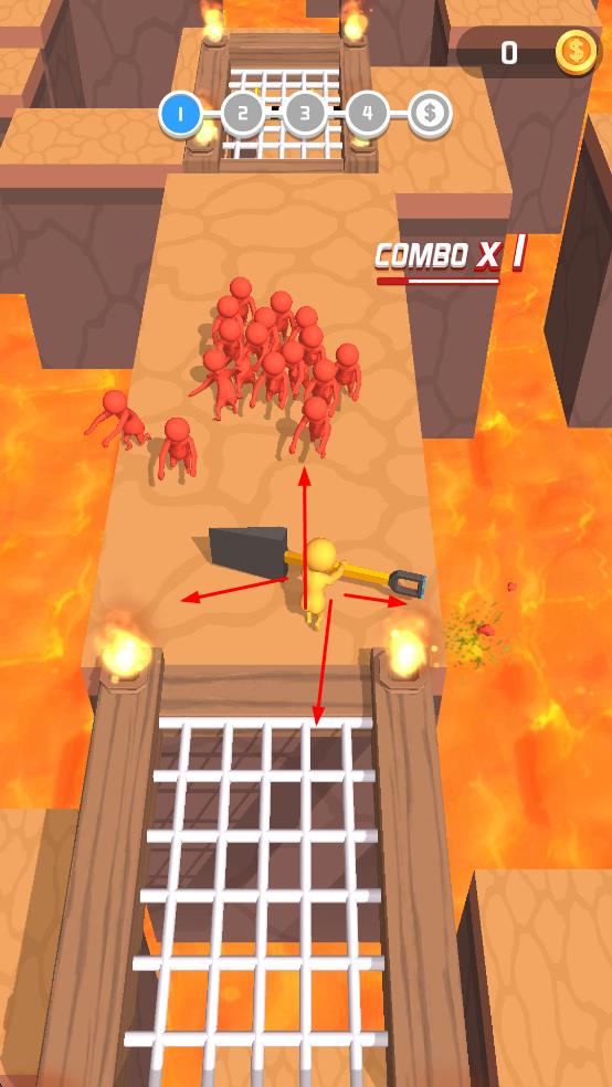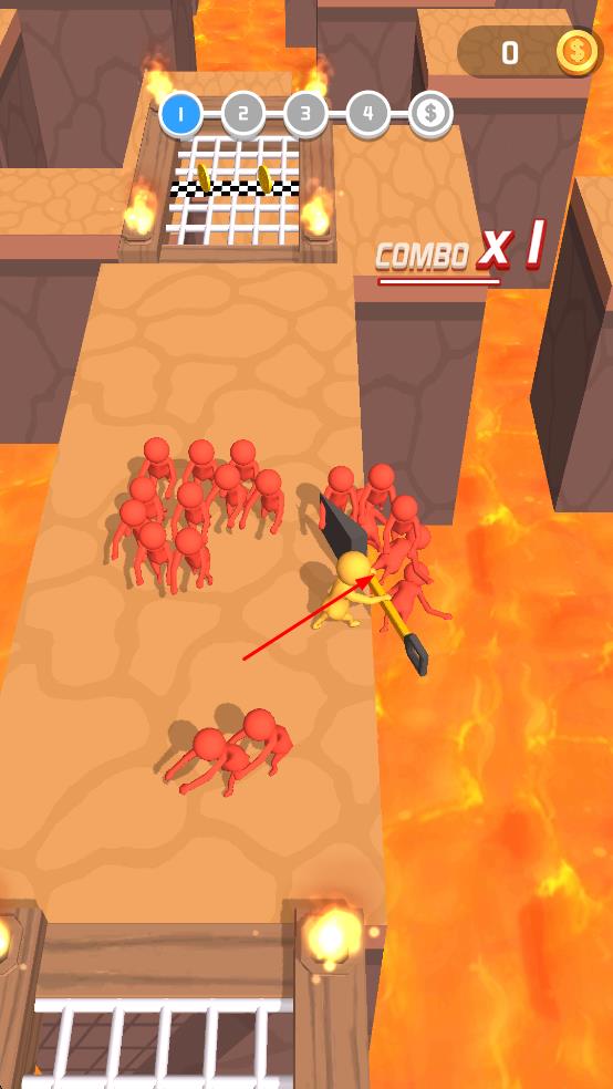 1、操控黄色小人在充满火焰和岩浆的场景中移动,手持工具,可以向前后左右四个方向移动,躲避红色小人的攻击。