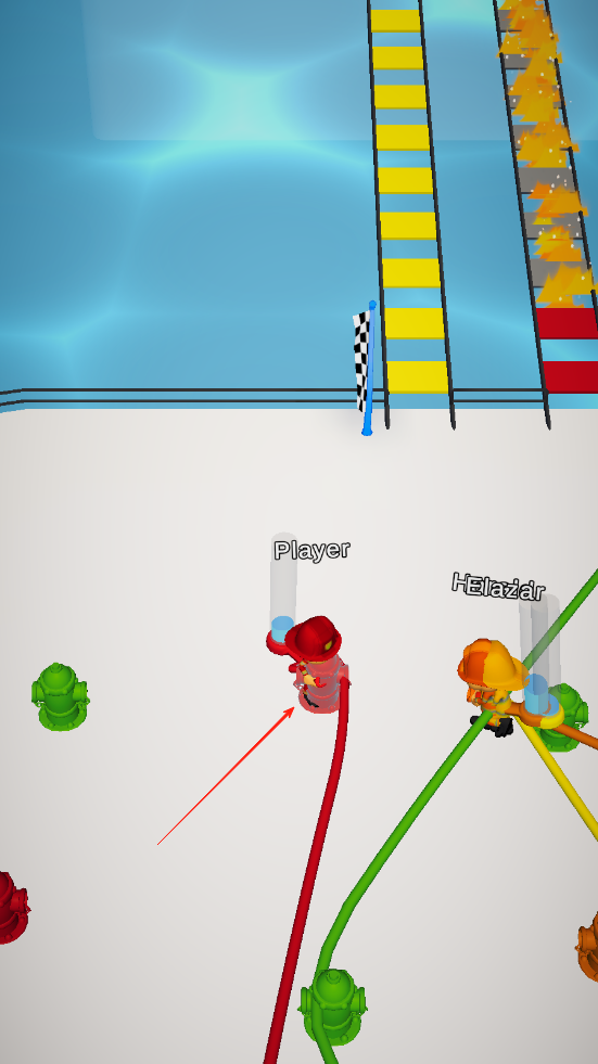 1、四位玩家各拿着一个水枪,我们需要碰到没有颜色的消防栓,将背后的水桶装满,背着水桶走上火梯灭火。