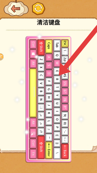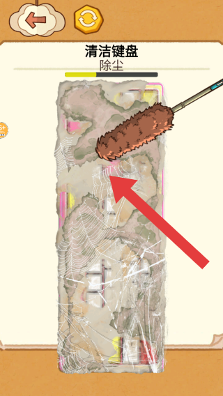 1、根据任务提示:清洁键盘除尘,呈现的是用工具清洁布满灰尘、蛛网的键盘的场景,属于模拟清洁玩法的内容。