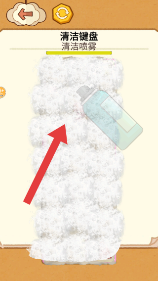 2、呈现的是用清洁喷雾处理键盘被白色泡沫覆盖状态的步骤,属于模拟清洁流程的玩法内容。