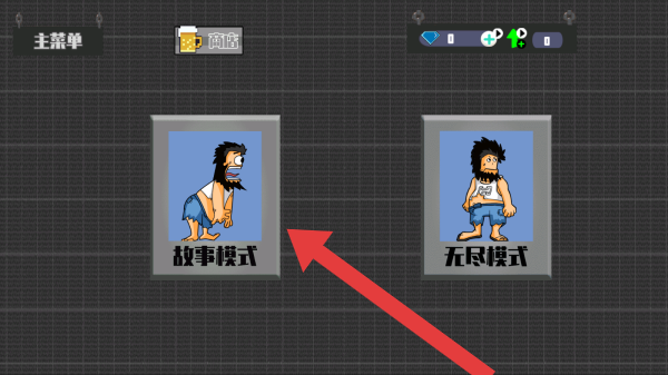 1、画面显示了故事模式、无尽模式,呈现了两种模式选择入口,可根据喜好进行选择以及主菜单和商店功能按钮。
