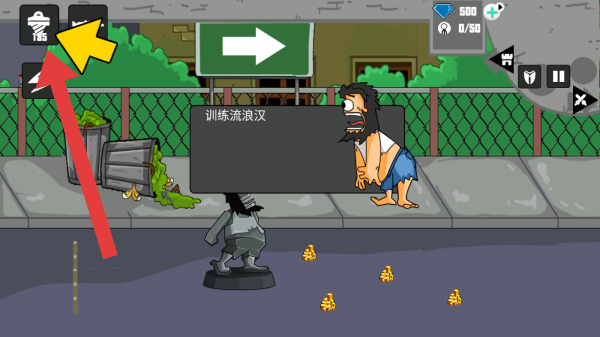2、根据文字提示:训练流浪汉,需要根据提示进行操作,画面中有垃圾桶、箭头指示牌。
