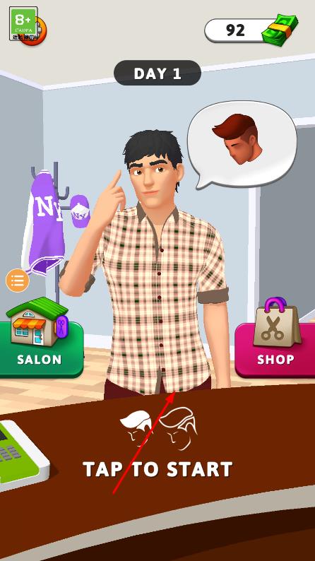 1、进入界面,显示顾客的形象和需求,点击TAP TO START按钮,开始为顾客理发,进入理发场景,屏幕左上角有顾客想要的发型图片。